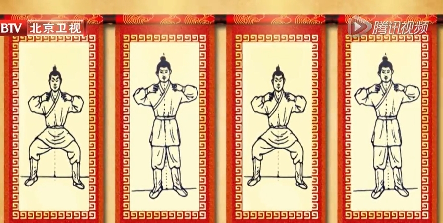 1、调姿:双腿屈曲分开,与肩同宽,如坐高凳,双手抱于胸前;