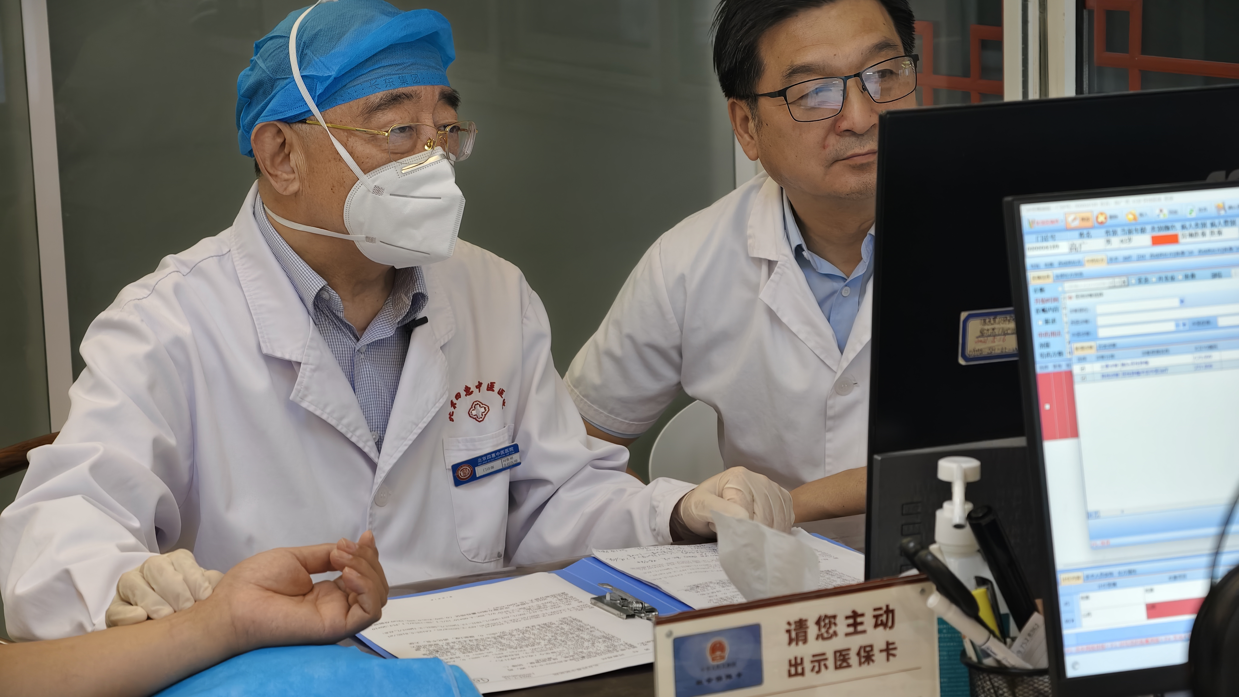 7月12日,上海市名中医刘鲁明教授(右一)与刘鲁明北京名医传承工作站团队成员常青芸医生(左一)一起为王女士复诊