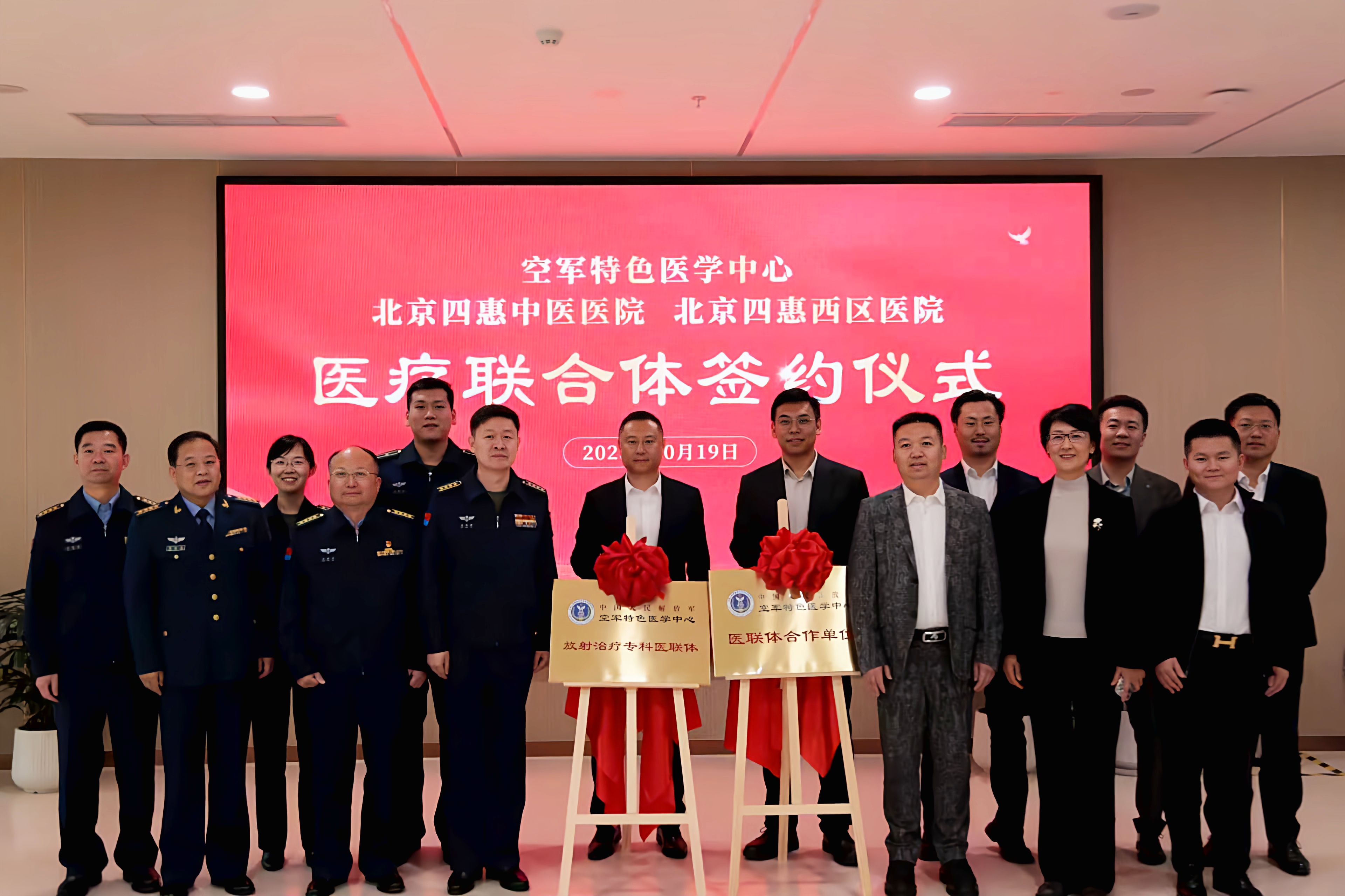 空军特色医学中心副主任高朝辉、四惠医疗集团董事长黄勇伟共同为“空军特色医学中心·北京四惠中医医院放射治疗专科医联体”揭牌