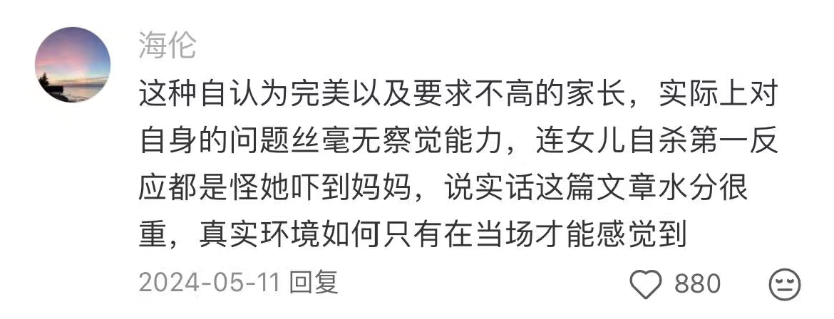 “‘懂事很早,从不叫我操心’,说明女儿一直都没有被理解过、被支持过,所以从小就自己完成很多事情,从不求助。这样的孩子曾经无数次发出过求助的信号,但也早就在一次次的失望中绝望了。”