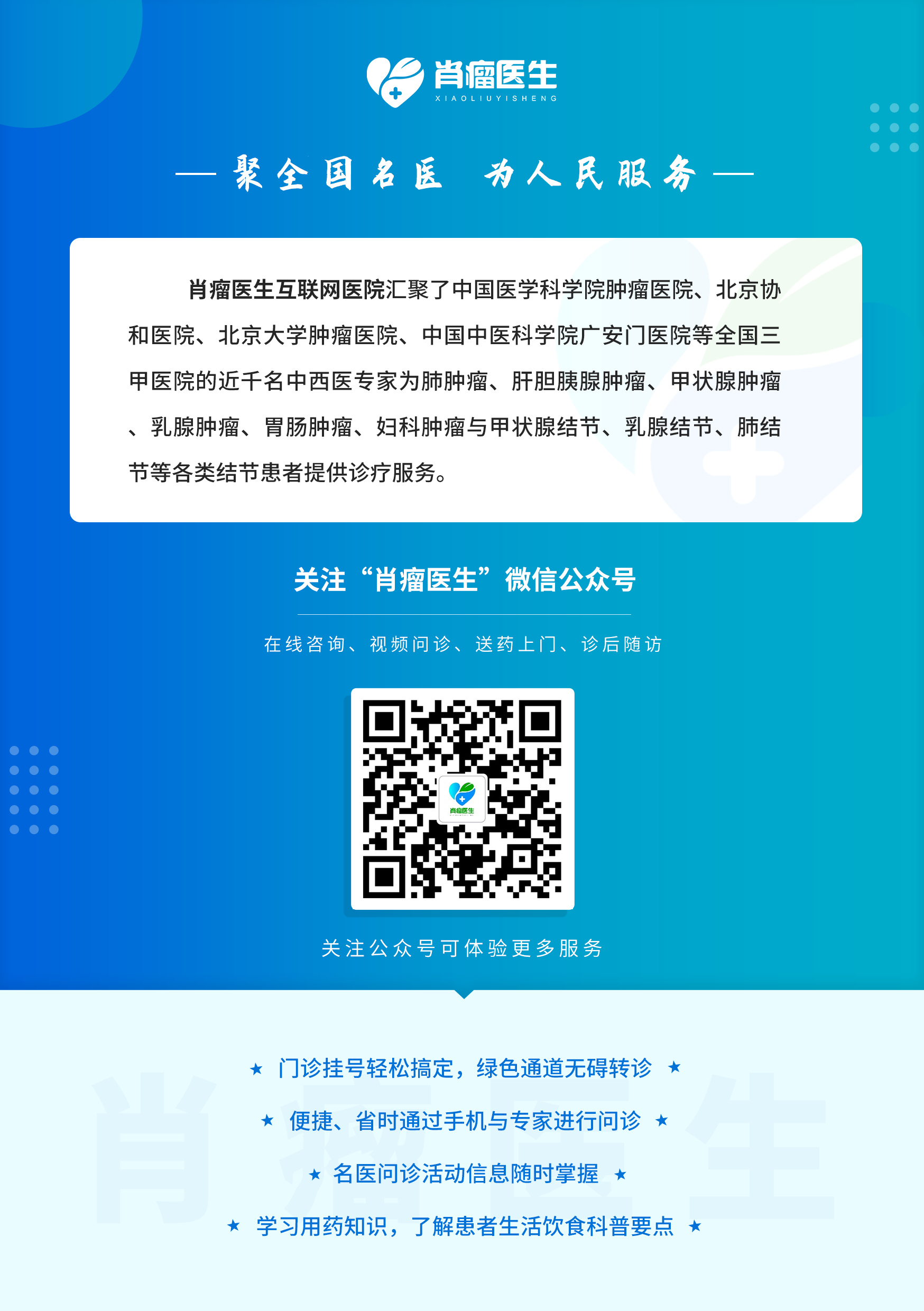 肖瘤医生互联网医院以“聚全国名医,为人民服务”的发展理念,汇聚了北京协和医院、中国医学科学院肿瘤医院、北京大学肿瘤医院、中日医院、北京医院、中国中医科学院广安门医院、北京中医药大学东直门医院、北京中医药大学东方医院、北京中医医院、上海复旦大学附属肿瘤医院、上海市中医院、上海中医药大学附属曙光医院、中山大学附属第一医院、广东省中医院、深圳市中医院、深圳市人民医院、福建省肿瘤医院、福建省人民医院、广西中医药大学附属瑞康医院、河南省人民医院、华中科技大学同济医学院附属协和医院、武汉大学中南医院等全国三甲医院近千名中西医专家为甲状腺结节、乳腺结节、肺结节等各类结节及各个部位疾病,肺肿瘤、肝胆胰腺肿瘤、甲状腺肿瘤、乳腺肿瘤、胃肠肿瘤、妇科肿瘤、淋巴肿瘤、消化道肿瘤、脑肿瘤、肾脏肿瘤等各类肿瘤患者提供诊疗服务。