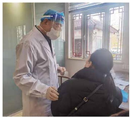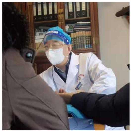 ▲接诊中,刘鲁明总是通过肢体动作,无声地向患者传递关爱和希望。每看完一位患者,他都会习惯性地与患者握手,表达祝福。